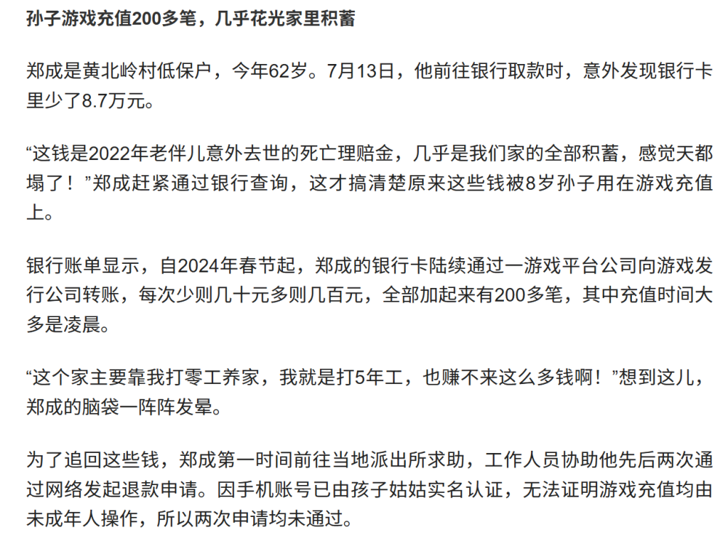 所以,大家猜测,孙子可能趁着爷爷半夜熟睡或忙碌时,一次次输入偷偷记下的付款密码,将8.7万元全部用于游戏充值。