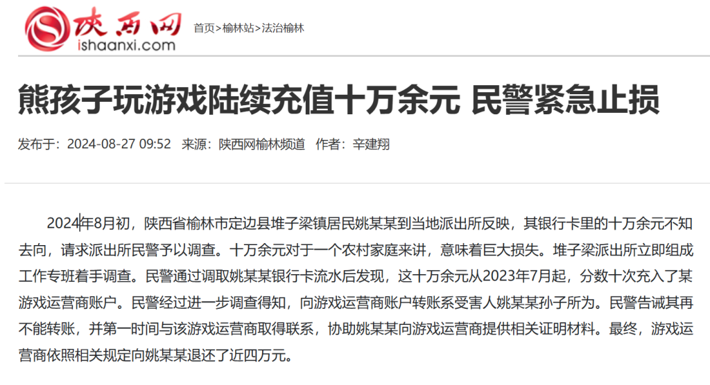 民警也提醒,家长或监护人应当密切关注孩子的游戏行为,妥善保管支付密码等敏感信息,防止孩子擅自进行大额游戏充值导致财产损失。