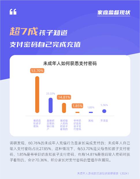 每日经济新闻发布的《未成年人游戏防沉迷现状调研报告(2024)》显示,在未成年人游戏充值环节中,超6成未成年人的游戏充值行为由家长完成。在自己完成充值的孩子中,有7成是知道支付密码的。