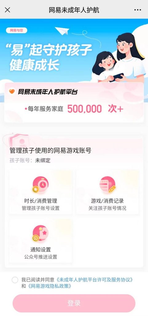 网易也有“未成年人护航平台”,家长们可以在微信公众号上关注“网易未成年人护航平台”公众账号,,登录并绑定孩子的账号,就可以管理孩子的游戏时长和消费充值等行为,还提供了“一键禁止游戏充值”、“一键禁止游戏登录”功能。